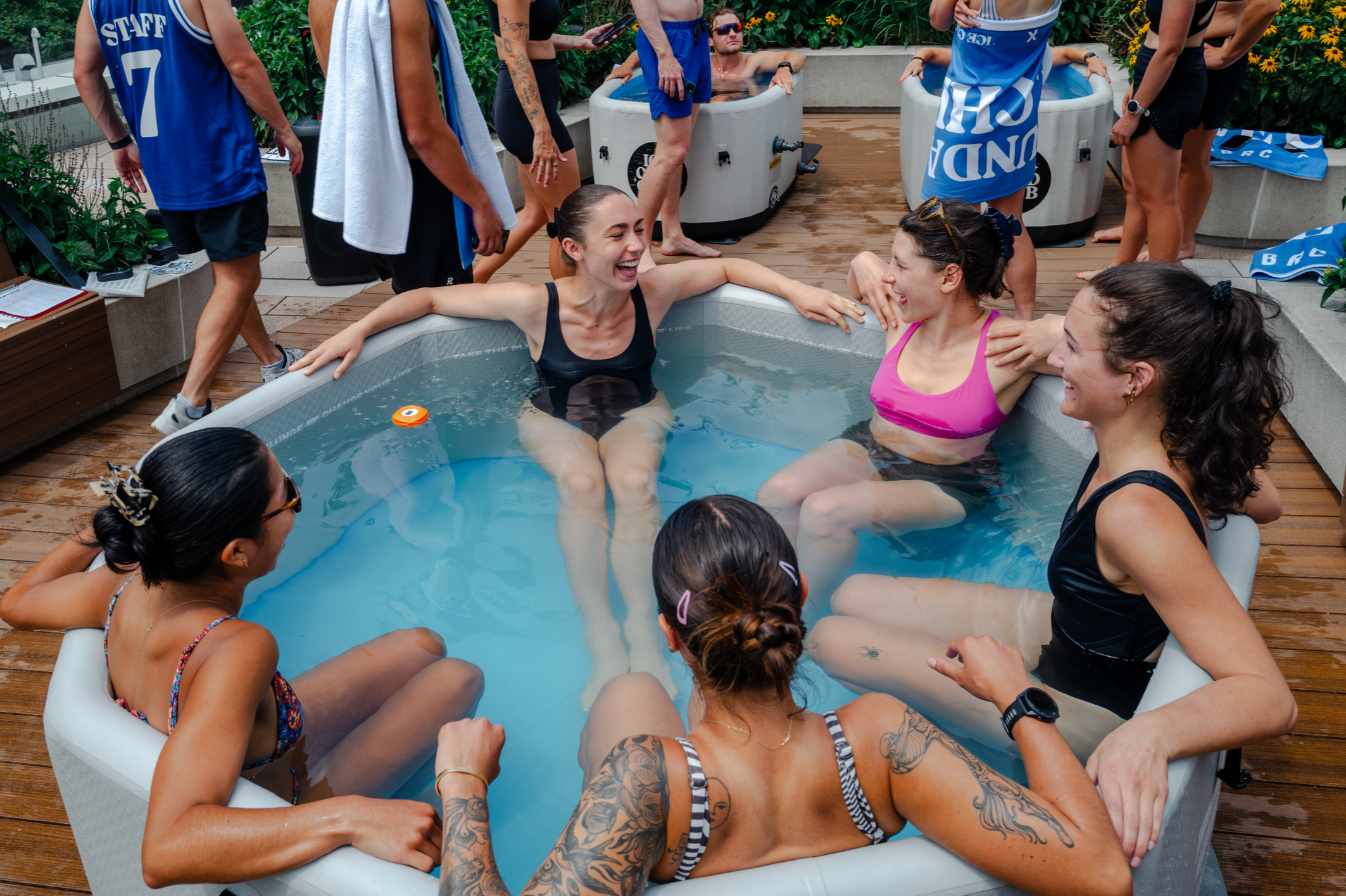Self-guided ice baths in our rooftop tub set to 48°F / 8.8°C at our Williamsburg location.